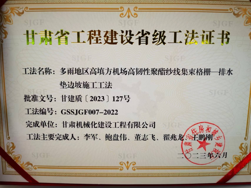 近年來,我司不斷加強(qiáng)技術(shù)創(chuàng)新和精品工程創(chuàng)建,科技創(chuàng)新能力和工藝水平再上新臺階。在承建的麗水機(jī)場土石方工程02標(biāo)段中,面對多雨地區(qū)高填方施工中的重難點(diǎn),公司專門組建了科研和施工小組,通過大量現(xiàn)場工藝實(shí)踐、工藝改善,提煉出項(xiàng)目重難點(diǎn)的關(guān)鍵技術(shù)。2023年6月,獲得了“多雨地區(qū)高填方機(jī)場高韌性聚酯紗線集束格柵—排水墊邊坡施工工法”。
