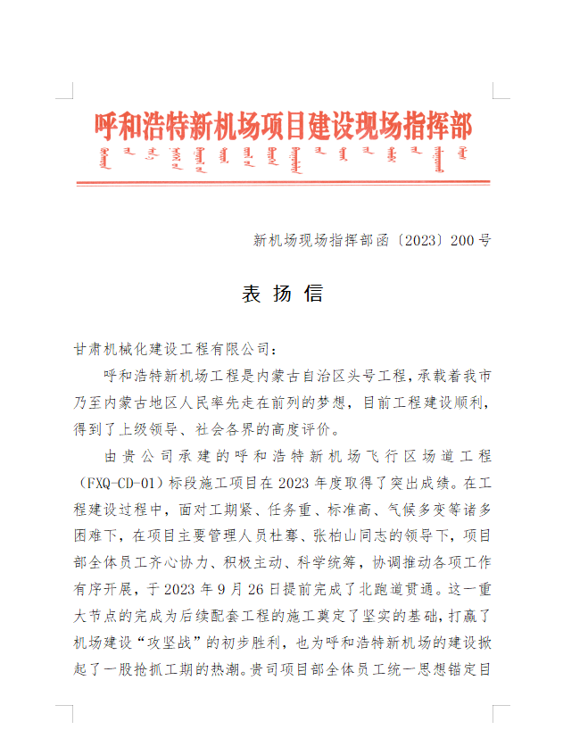 2023年9月28日,呼和浩特新機(jī)場項(xiàng)目建設(shè)現(xiàn)場指揮部給我司發(fā)來表揚(yáng)信,信中充分肯定了我司在呼和浩特新機(jī)場項(xiàng)目建設(shè)中項(xiàng)目部全體員工統(tǒng)一思想錨定目標(biāo)、精心組織管理、發(fā)揚(yáng)艱苦奮斗、迎難而上、攻堅(jiān)克難的鐵軍精神,合理調(diào)配資源、強(qiáng)化安全質(zhì)量管理,圓滿完成了指揮部下達(dá)的各項(xiàng)施工任務(wù)。